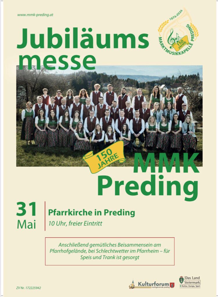 Willkommen auf der Website der Marktmusikkapelle Preding Unterstützendes Mitglied werdenNächste Veranstaltungen 25. April 2026 Konzertwertung 9:00 Mehr Konzertwertung 1. Mai 2026 Maibaumaufstellen 11:00 Mehr Maibaumaufstellen 3. Mai 2026 Erstkommunion 10:00 Mehr Erstkommunion 31. Mai 2026 150 Jahre-Jubiläumsmesse der MMK-Preding 10:00 Mehr 150 Jahre-Jubiläumsmesse der MMK-Preding 4. Juni 2026 Fronleichnam 9:30 Mehr Fronleichnam + Alle Veranstaltungen ansehen Neuigkeiten 7. April 2026 Jubiläumsmesse -150 Jahre MMK-Preding 31. Januar 2026 150 Jahre MMK-Preding 31. Dezember 2025 Wünschezeitung 2025 Alle Neuigkeiten ansehen KONTAKT OBMANN Stefan Knappitsch knappitsch.stefan@gmx.net 066488996177
